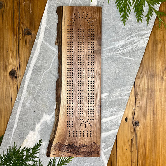 Mountain Skyline Live Edge with Bark Black Walnut Cribbage Board