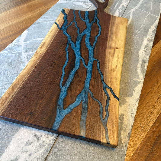 Large Black Walnut Charcuterie Board - Blue Hand-Carved Lightning Epoxy
