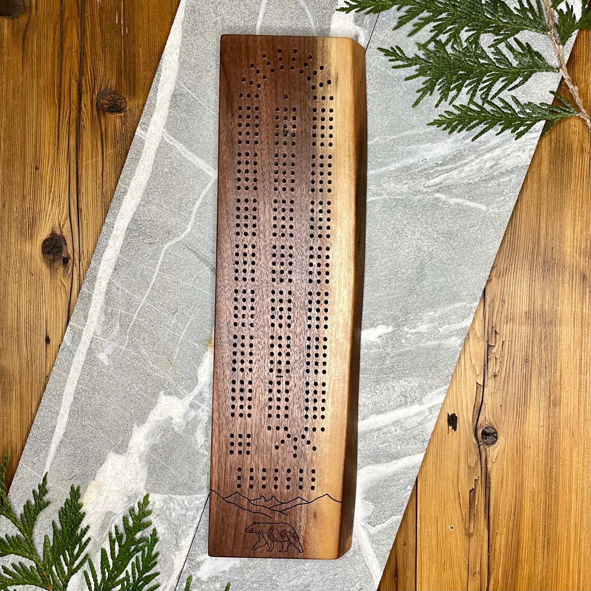 Black Bear with Mountains Live Edge Black Walnut Cribbage Board